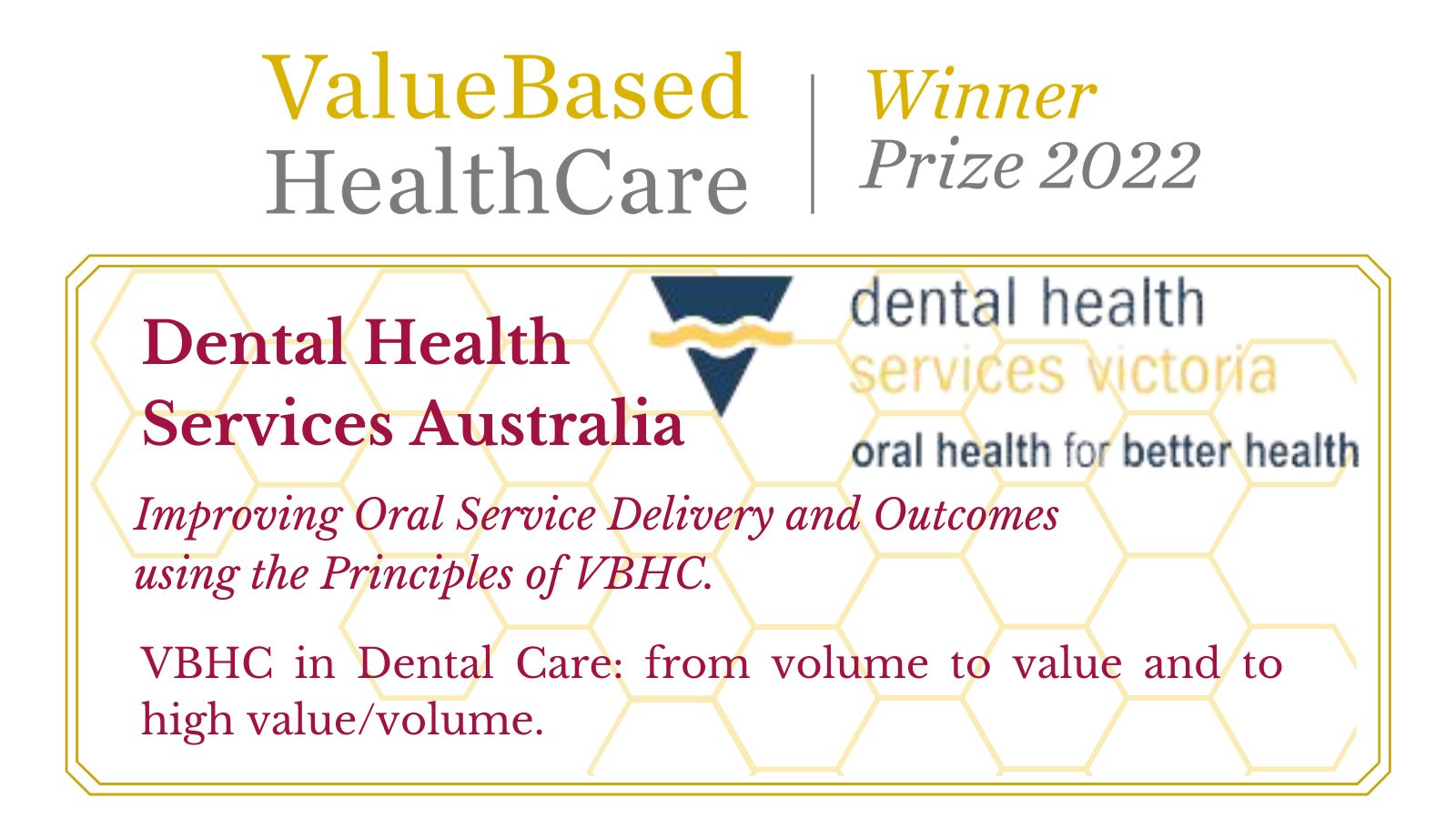 Victoria’s lead oral health organisation, Dental Health Services Victoria (DHSV), has won the prestigious international 2022 Value Based Health Care (VBHC) Prize.