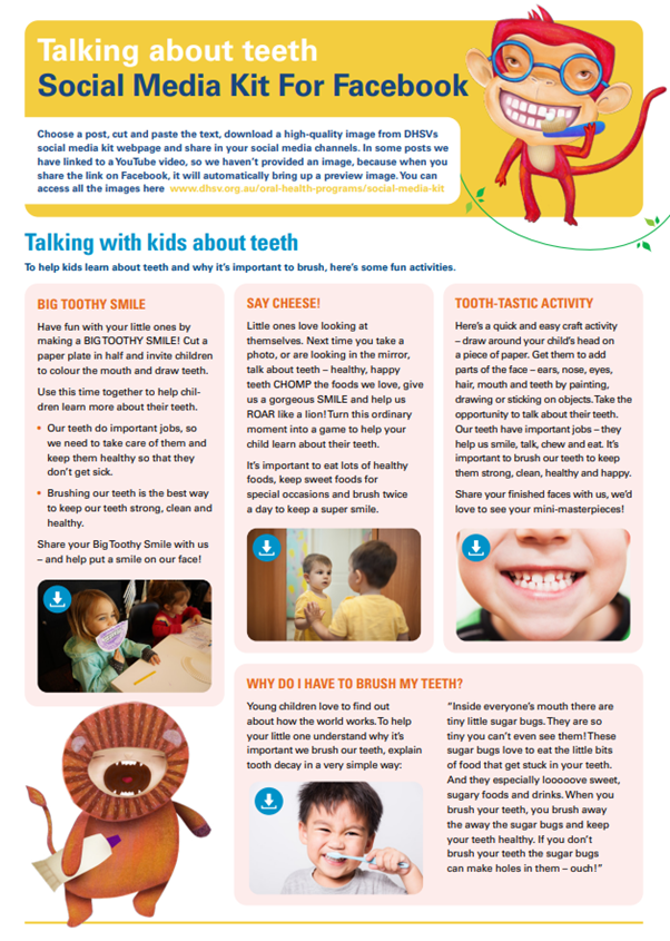 | Collection of templates and images to share via social media posts or parent portal DOWNLOAD Talking about teeth: Social Media Kit DOWNLOAD introduction to Social Media Kit |